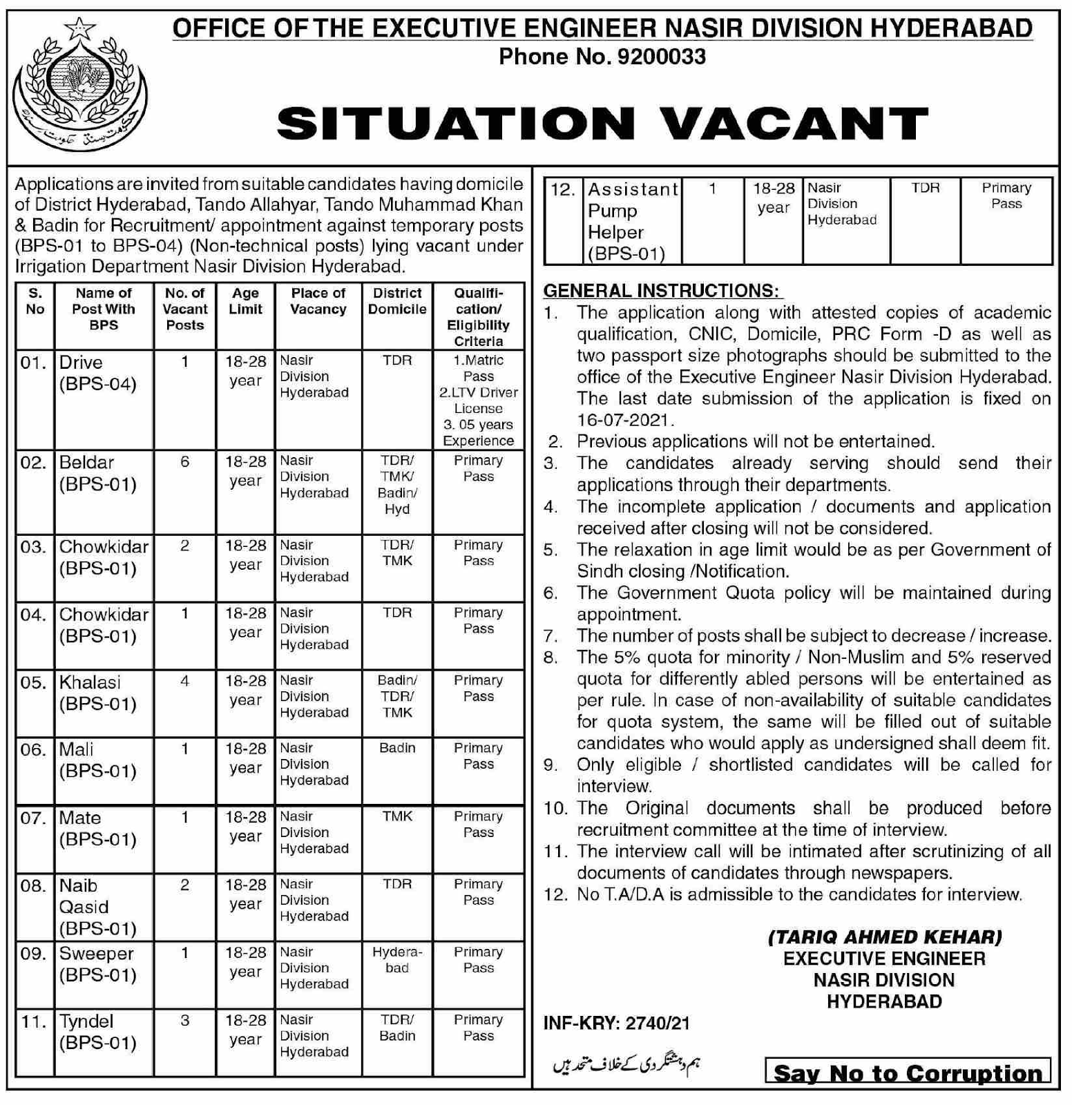 This page is about Executive Engineer Office NASIR Division Hyderabad Jobs 2021 Latest Advertisement. Executive Engineer Office NASIR Division Hyderabad invites applications for the posts announced on a contract / permanent basis from suitable candidates for the following positions as Driver, Beldar, Chowkidar, Khalasi, Mali, Mate, Naib Qasid, Sweeper, Tyndel, Assistant Pump Helper. These vacancies are published in Dawn Newspaper, one of the best Newspapers in Pakistan. This advertisement has published on 05 July 2021 and the Last Date to apply is 16 July 2021.